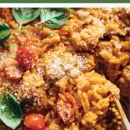 Dinner is ready! Creamy baked orzo with bits of garlic butter peeking through, a luscious tomato-y base, and meatballs if you want. Silky, cozy, and a hit with everyone!
