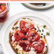 But over the last year and a half as I’ve made these, I find that they often start as a pre-dinner snack… and just eventually turn into dinner. Lol. I can’t count the number of times I’ve thrown a jar of these strawberries together in the afternoon, assembled some toasts for a summery outside snack at that magical (challenging) 4pm hour, and then watched as everyone devoured enough bread, cheese, and strawberries to be happy for the rest of the evening. Works for me.