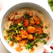 5. You’re Done! Top each bowl of soup with a pile of seasoned tots, some cilantro and green onion, and a shot of hot sauce if you want. Absolute delight.